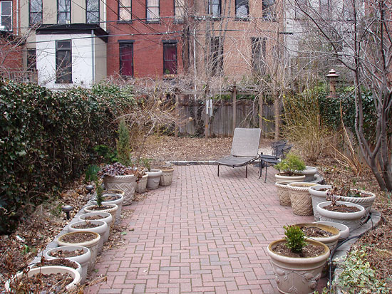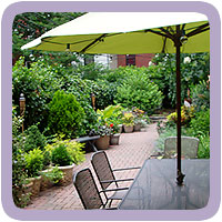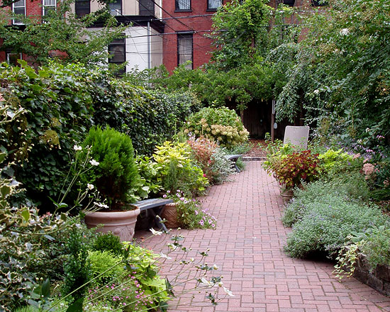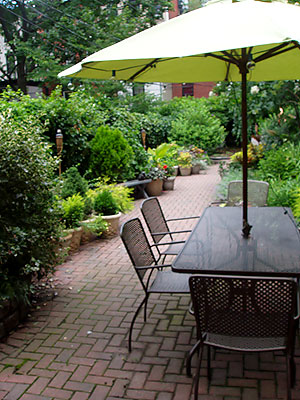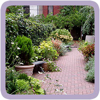 Originally designed as a dog run, this narrow garden has been redesinged to be of more use and enjoyment for humans. The addition of garden furniture, areas for seating, and lots of containers filled with dwarf conifers, herbs, and colorful annuals helps to achieve that goal.