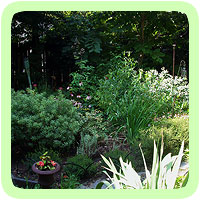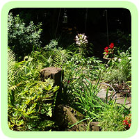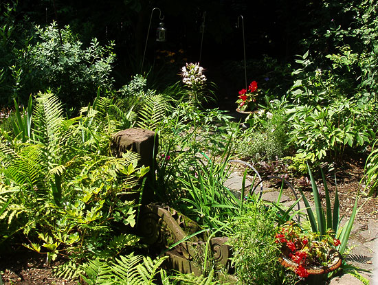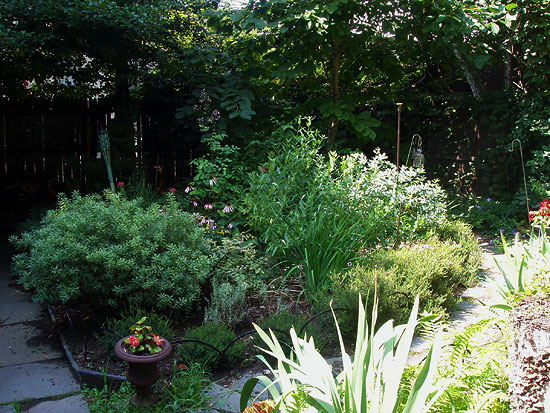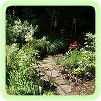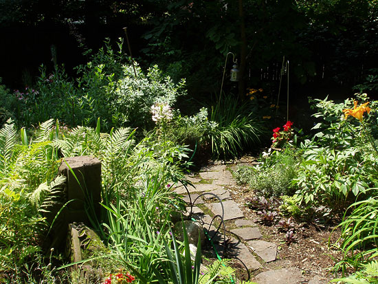 With its relaxed, flowing lines, this natural garden has a rambling "crazy paving" path that meanders through the garden. The architectural focal point, probably part of the balustrade from the front staircase, was found buried in the garden and is used as a support for a climbing clematis. This garden has a beautiful magnolia tree, lots of purple irises, and ostrich ferns.